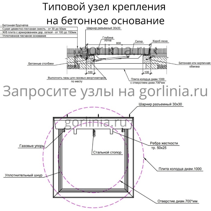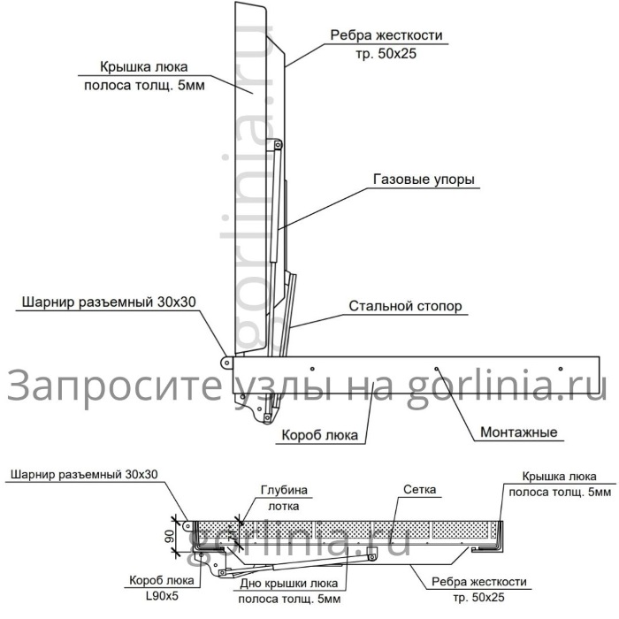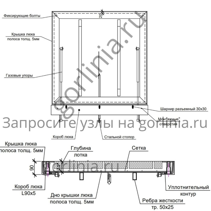 Модель с внешними разъемными шарнирами на болтах для возможности покрытия цинком. Механизм с усиленными газлифтами 2000Н, стопорным устройством автоматической фиксации в открытом положении. Запорное устройство на винтах. Две съемные рукоятки по углам для поднятия крышки. Ленточное эластичное уплотнение по притвору.