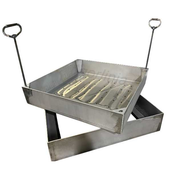 Полую крышку вынимают специальными крюками через отверстия по углам корыта. Для удобства установки рекомендуем заказать исполнение с крепежными ушами (пластинами). Усиление каркаса крышки профилем 50х25 также является дополнительной опцией (см. галерею фото)