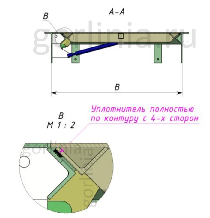 Объемное соединение сортового уголка 63х40, 40х40 в коробке многократно увеличивает несущую способность опорно-укрывного элемента. Дверца в комбинированной обвязке из уголка 40х40, профиля 50х25 и 30х30 обшита металлическим листом «чечевица» мм в теле, окрашена порошковой эмалью.