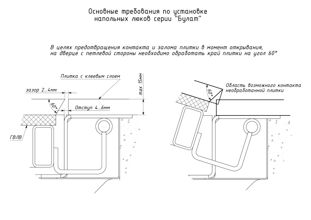 Каркас полотна сварен из трубы 30х20 в комбинированных положениях с заполнением ГВЛ в уровень коробки под облицовку плиткой по принципу невидимки с сохранением рисунка и швов раскладки керамогранита в комнате. Для открывания лаза в погреб 1150х700 используется съемная ручка.