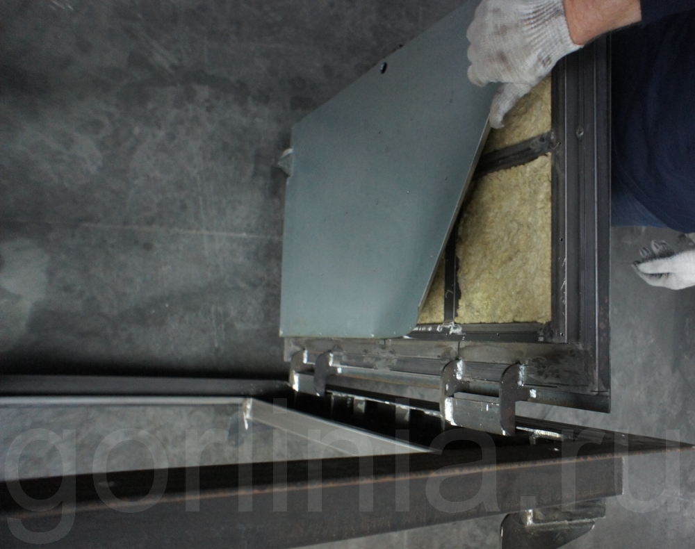 Створка открывается по стороне 1200 мм. Рама сварена из уголка 63х63 мм. Внешний габарит по раме 815х1315 мм. Световой проём составляет 540х1150 мм.